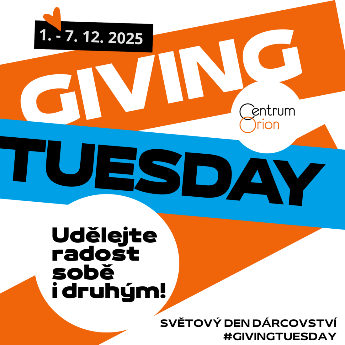 Giving Tuesday je světový den štědrosti a dobrých skutků. Slaví se od roku 2012 vždy první úterý po Dni díkuvzdání a jako protipól nákupnímu šílenství Black Friday. V tento den se stovky milionů lidí napříč všemi kontinenty spojí, aby inspirovaly ke štědrosti a konaly dobro. Udělejte společně s námi nejen na Giving Tuesday něco dobrého. Každý dobrý skutek a projev štědrosti se počítá. Více o Giving Tuesday…